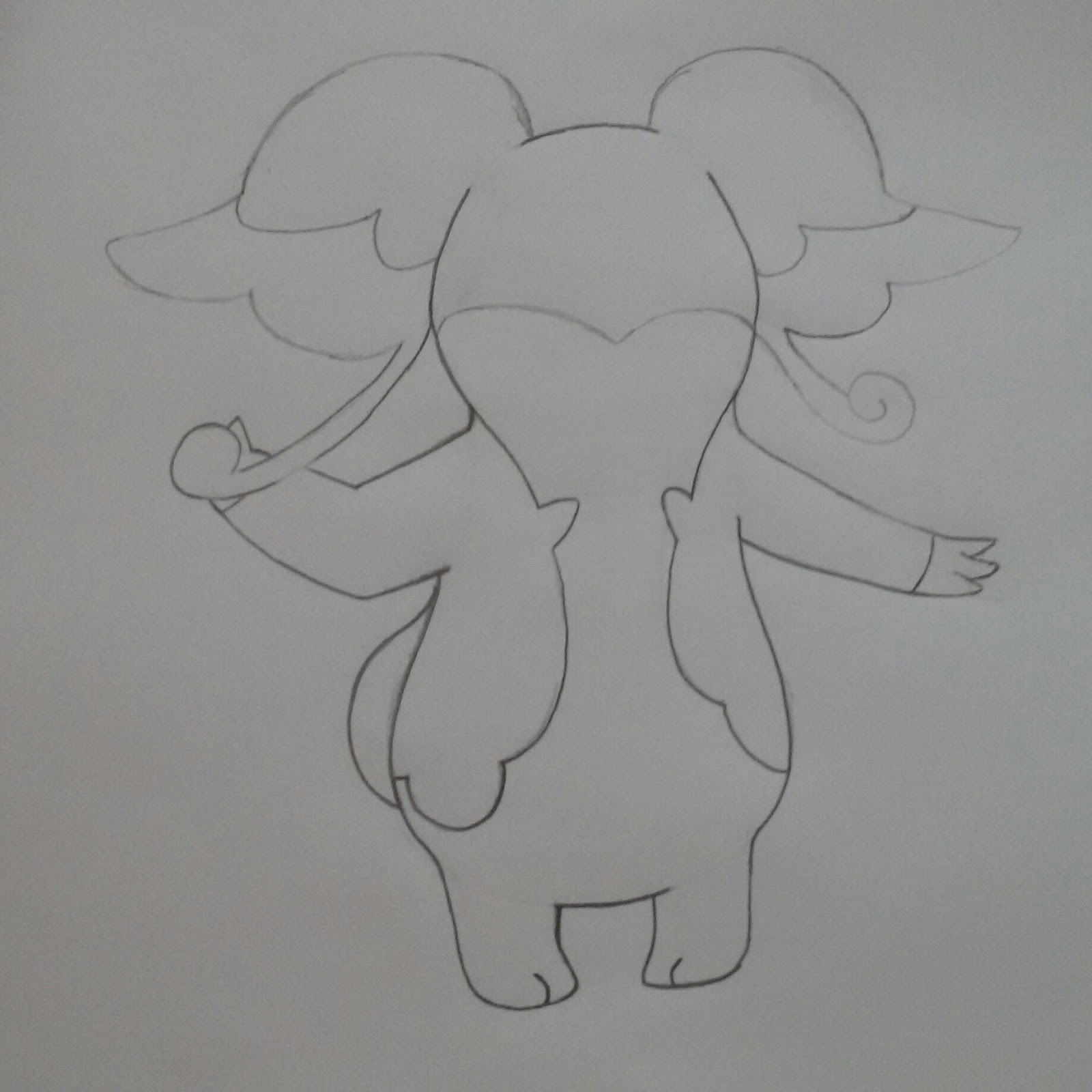 3) Depois apague os traços desnecessários. Desenhe as orelhas, as antenas e o detalhe do rosto de Audino.